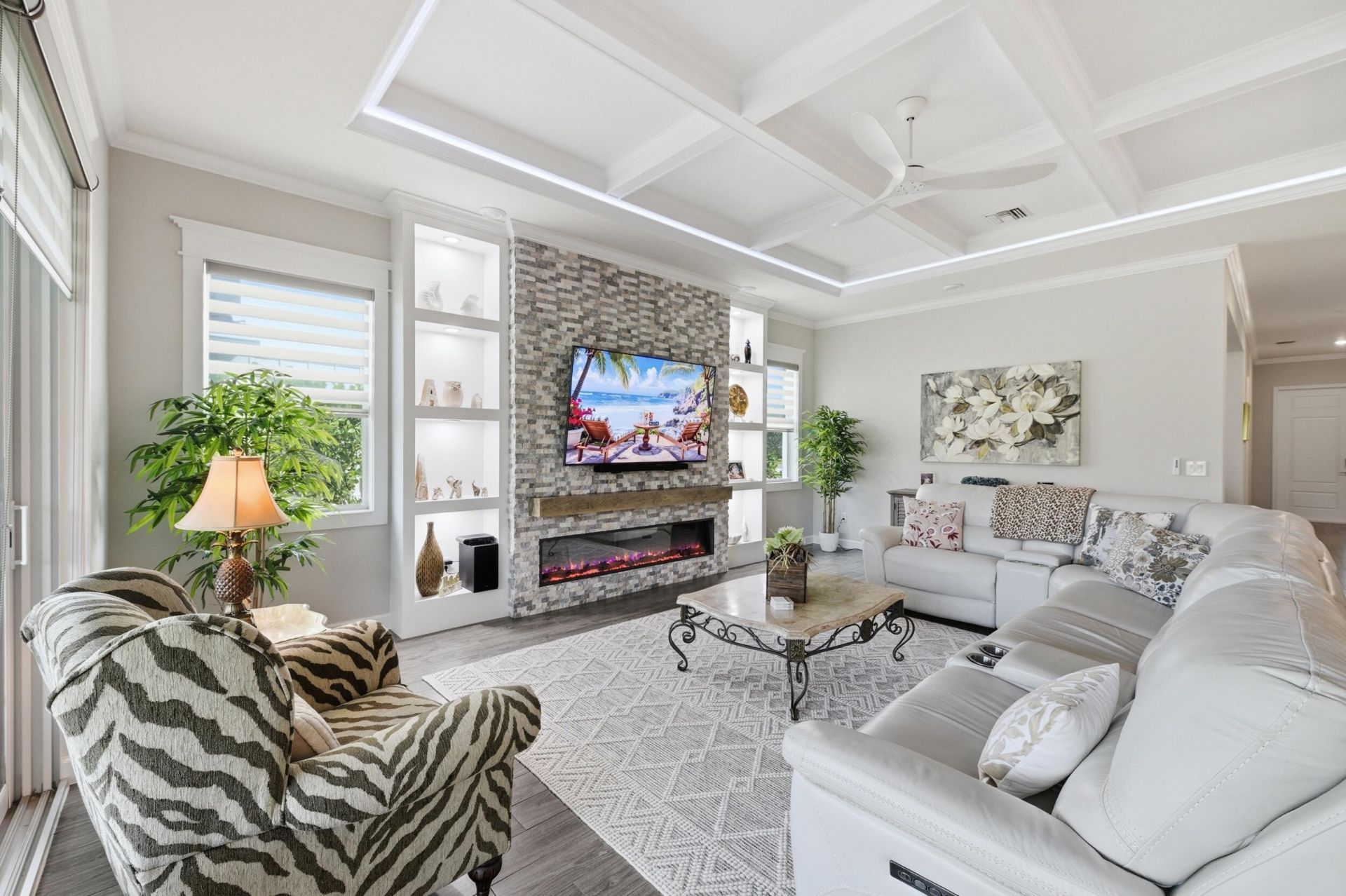 Situated on over a 1/4-acre lot, this beautifully maintained 3-bedroom + office home backs to serene greenspace and features a fully fenced yard. Designed to impress, it shows like a model and is truly move-in ready. Highlights include custom millwork, porcelain tile flooring, crown molding, custom window treatments, and built-out closets and all newer appliances. All windows are custom framed, and a stunning feature wall showcases a stone fireplace with integrated lighting and shelving. A coffered ceiling with lighting adds architectural elegance. Both interior and exterior have been recently painted. Additional features include a tile roof, screened patio, and a whole-house water purification and softening system installed in 2025. Lightly lived in and meticulously cared for.