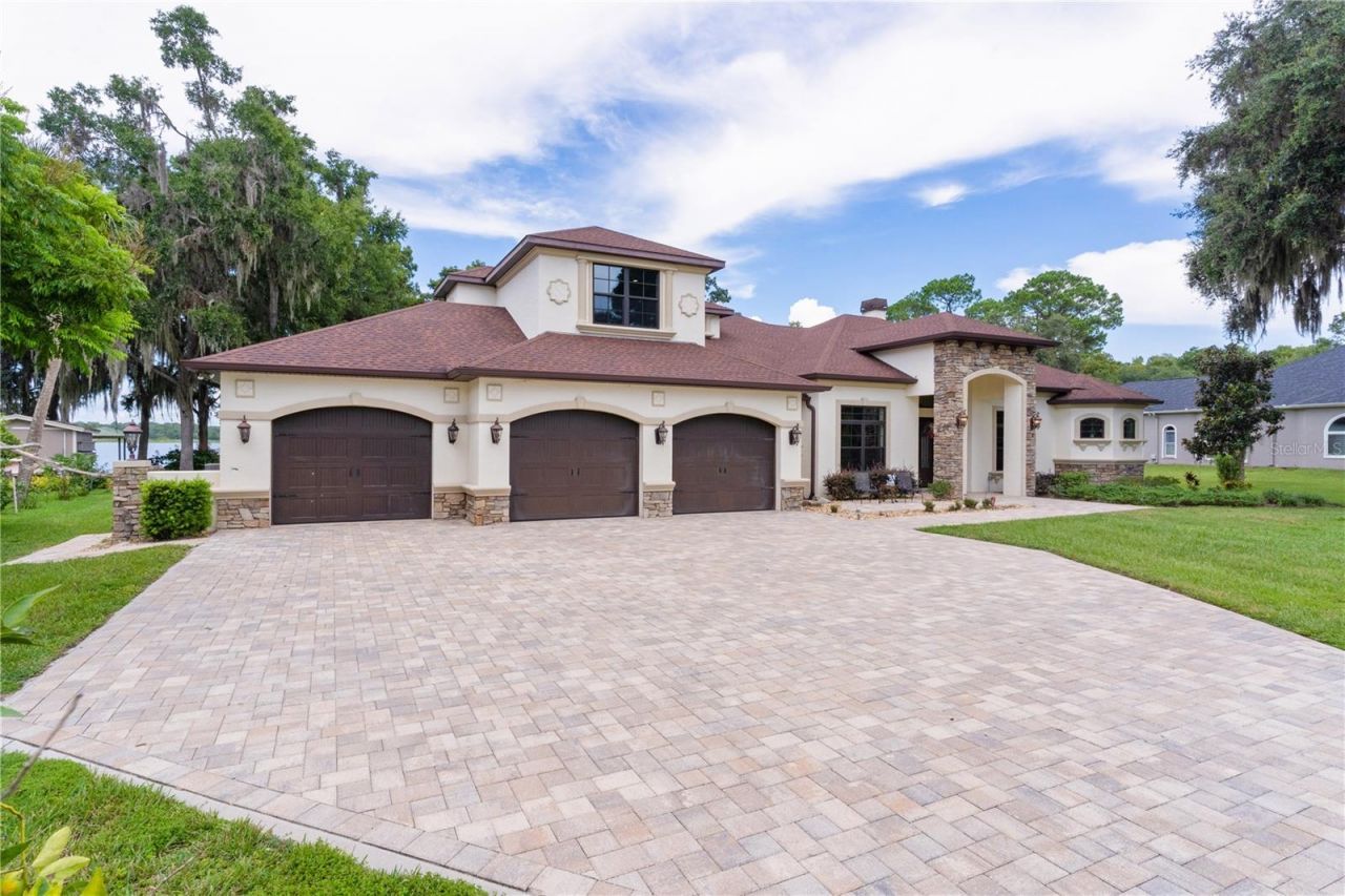 Almost 4000 sq ft stunning, lakefront home in the Gated community of Riverwood Ranch, non other like it, each lot over an acre. You'll see less than 22 hses in the entire subd. A quick boat ride to Rainbow Springs for swimming, snorkeling, a float down the river or bass fish in your own byd. Owners have this as a 2nd home, an occasional get-away.. absolutely impeccable on the inside and out. You are welcomed by a brick paved driveway. Home offers 4 bedrooms, 3 1/2 baths, plus 2 offices. Huge great rm (gas f/pl) opening to kitchen, formal dining area, plus dinette. Enjoy the lakefront view from numerous rms.. Kitchen First Class Everything: large island, granite countertops, dbl convention oven, stove cooktop is gas, wine cooler, walk in pantry, wine bar, & coffee bar. Massive primary bedroom downstairs and a quest bedroom downstairs as well(Lakeview). Upstairs yet a 2nd living area:(great for inlaws, teens, guests) offering a spacious living rm, corner area with small sink & mini fridge, 2 bedrooms with joining bath. Huge window at end of living room overlooking the lake. Backyard has large screened in area for your yr round grilling with outdoor fireplace. Summer kitchen with sink & mini fridge. Outside lanai continues with brick pavers. Boat dock with lift. Fishing pier, sitting area. 3 car grg. 2 car is 25x32, and 3rd one is 14x28 with door on each end of 3rd one . You will not be disappointed when u view this home. Sellers are offering this furnished (please know formal dining furniture does not coney-but will replace with another set from their other property). Boat does not covey, but can be bought separately. This community offers tranquility if you're looking for that, yet within 20 minutes of shopping needs. Hospital less than 10 minutes away.