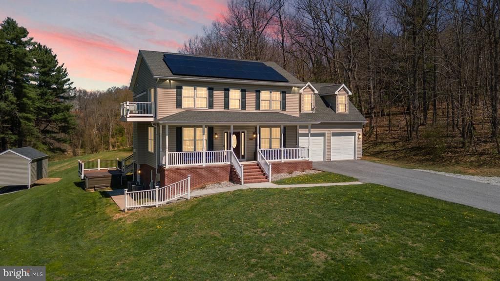 Perched atop a hill on 4.75 acres, this exceptional 4-bedroom home offers breathtaking panoramic views of rolling farmland and is surrounded by 60 acres of protected open space—providing unmatched privacy and serenity. Thoughtfully designed and beautifully appointed, the home also features owned solar panels for energy efficiency and long-term savings. The main and upper levels showcase gorgeous hardwood floors throughout, with an expansive living room filled with natural light from large windows and anchored by a cozy propane fireplace. The stunning kitchen is a true showpiece, featuring a 48” 8-burner double-oven range with stainless vent hood, quartz countertops, a large center island, beautiful backsplash, and all stainless steel appliances—perfect for both everyday living and entertaining. The luxurious owner’s suite offers a private retreat with its own propane fireplace accented by granite, a spacious walk-in closet with built-in shelving and convenient laundry, and a spa-like ensuite bath complete with heated tile floors, an oversized tiled step-in shower with rain head, a relaxing jetted tub, and a double sink quartz vanity. Step outside onto the private balcony and take in the stunning views. Two additional generously sized bedrooms and a full bath complete the upper level. The fully finished lower level includes a private entrance and is ideal as an in-law suite or guest quarters, featuring a large bedroom, open living area, a full kitchen with stainless steel appliances, a full-size laundry room, and a full bath with heated tile floors and a double sink vanity. Outdoor living is just as impressive, with a welcoming front porch perfect for enjoying peaceful mornings and sweeping views, as well as a two-level rear deck ideal for entertaining, including a designated space for a hot tub. The property also includes an attached 2-car garage and an oversized detached 3-car garage that can accommodate up to 6 vehicles, complete with a car lift and additional storage space above, plus a separate storage shed. Ideally located just minutes from shopping, dining, and downtown amenities, this extraordinary property offers the perfect balance of luxury, privacy, and accessibility.