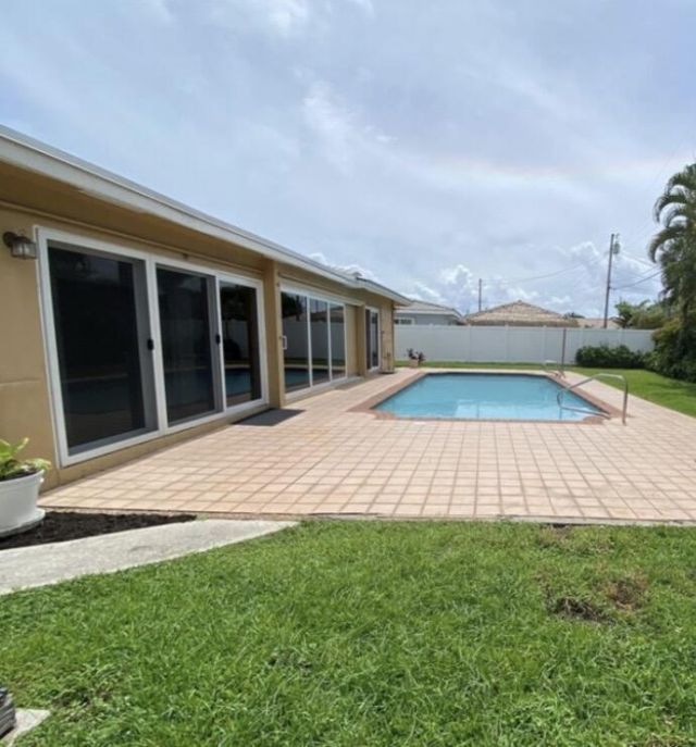 Spacious 3/2 with salt water pool in a fabulous East Deerfield Beach location. Impact windows and doors throughout. Large family room overlooking the pool area. Totally fenced yard with a shed for tenants to use. Double gate on side of home to store trailer or boat. Washer and dryer are not provided but hookup is in place. Super clean and ready for a quick move in.