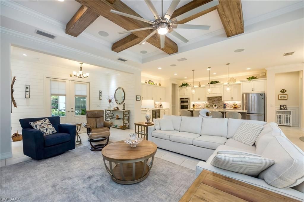 Experience elevated Florida living in this meticulously upgraded 2020 Stock Development Siesta model, where luxury and functionality come together seamlessly. The backyard is designed for true indoor-outdoor living, featuring a custom heated saltwater pool, expansive entertaining area, and a fully equipped outdoor kitchen—set within an exceptionally quiet and private setting that creates the perfect retreat. Inside, the home showcases a beautifully appointed chef’s kitchen with quartz countertops, glass tile backsplash, and designer lighting, all flowing into refined living spaces highlighted by crown molding, custom wainscoting, plantation shutters, and striking cypress ceiling beams. The primary suite offers a private retreat with a spa-like bath, including dual vanities, a soaking tub, and a frameless walk-in shower, complemented by a spacious walk-in closet. Built with comfort and peace of mind in mind, this home includes impact-resistant windows, Storm Smart hurricane screens, a whole-house Generac generator with a 500-gallon propane tank, a Reme Halo air purification system, surround sound, and a security system. The insulated, air-conditioned garage with built-in storage adds everyday convenience, while lush landscaping enhances the home’s sense of privacy. Located within Naples Reserve, residents enjoy a vibrant, resort-style lifestyle centered around 22 lakes, scenic walking trails, a rowing lane, and world-class amenities including a clubhouse, fitness center, resort-style pool, tiki bar, pickleball, tennis, bocce, dog parks, and more—all within a gated community.
