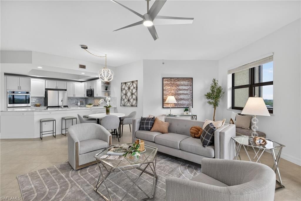 High above the treetops and overlooking shimmering lake waters, this beautifully updated residence at Riva del Lago invites you into a world of calm, comfort, and quiet luxury. From the moment you step inside, you feel it — the sense of ease, of space, of having arrived somewhere special. The kitchen immediately captures your attention. Completely remodeled, it blends bright white cabinetry with striking quartzite countertops and a sophisticated tile backsplash that adds just the right touch of drama. Stainless-steel appliances with a transferable warranty enhance everyday convenience, while the open layout keeps you connected to the views, the light, and the people you love. Slide open the doors to the expansive lanai and the scene unfolds: wide-open lake views, peaceful nature, glowing sunsets. This is where mornings begin slowly and evenings linger just a little longer. The primary suite feels like a private spa retreat. Its fully remodeled bathroom offers a freestanding soaking tub, generous walk-in shower, and dual vanities — a beautiful blend of relaxation and refined design. Fresh paint, new carpet, and thoughtfully organized closets throughout the residence create the impression of a home that has been lovingly renewed from top to bottom. Convenience meets luxury with the largest private storage unit, two under-building parking spaces, and a dedicated bike room — perfect for enjoying the outdoor lifestyle that surrounds the community. Riva del Lago delivers resort-style living every single day. A dramatic infinity-edge pool overlooking the lake, two Jacuzzis, fitness center, business rooms, library, club room, billiards, tennis courts, canoe/kayak dock, and the rare privilege of private gated access into Lakes Park — miles of walking paths, wildlife, boating, and one of the area’s favorite farmers markets. With friendly neighbors, HOA fees that simplify life by covering nearly everything except electricity, and a home warranty already in place, this condo offers not just beauty — but peace of mind. Close to shopping, dining, and everything vibrant in Fort Myers, this residence is more than a condo. It is a retreat. A reset. A place where water, light, and thoughtful design come together to create a feeling you simply won’t forget.