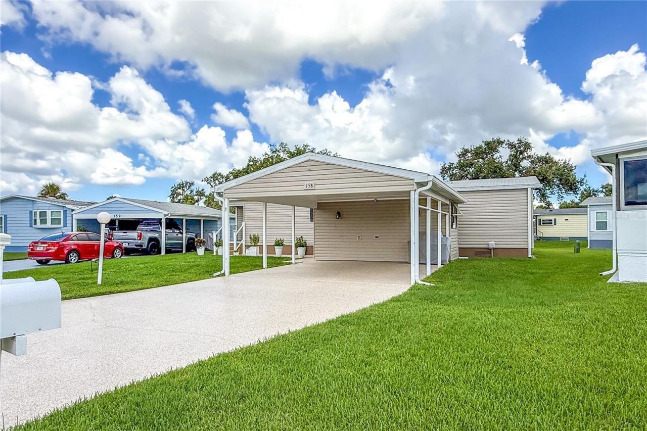 Stunning! Beautiful land owned 2bd/2ba home located on a very large lot with water views in the 55+ community of Ridgewood Meadows. Rare 2-car carport which can be converted into a 2-car garage and a textured painted driveway/walk-way. Large custom designed outside storage/workshop with new lighting and drywalled walls. New AC, gutters, storm door and French doors with built in blinds lead out to the lanai from the living room. A new screen lanai has just been added with a new roof, gutters and underground downspouts with great view of the water. Inside all new Low E windows have been installed with quartz sill plates and gorgeous new laminate flooring throughout the home. The home has all new plumbing, elongated high toilets, custom lighting and the primary bath has a custom shower with glass doors. Both bathrooms have new vanities with quartz counter tops, custom lighting and all rooms have been repainted. The primary bedroom has an amazing barn doors on the custom closet and the owners have created a custom pantry too! This is a must-see home with too many upgrades to list. The Ridgewood community provides 24 hour/day, 7 day/ week gated security. Easy access to shopping, the interstate, restaurants and minutes away from the gulf beaches. New pickle-ball courts, exercise park, tennis courts, community pool, great fishing, club house and lots of activities to enjoy. All room sizes are approximate. All information is deemed reliable but should be verified by buyers and/or buyer's agent.