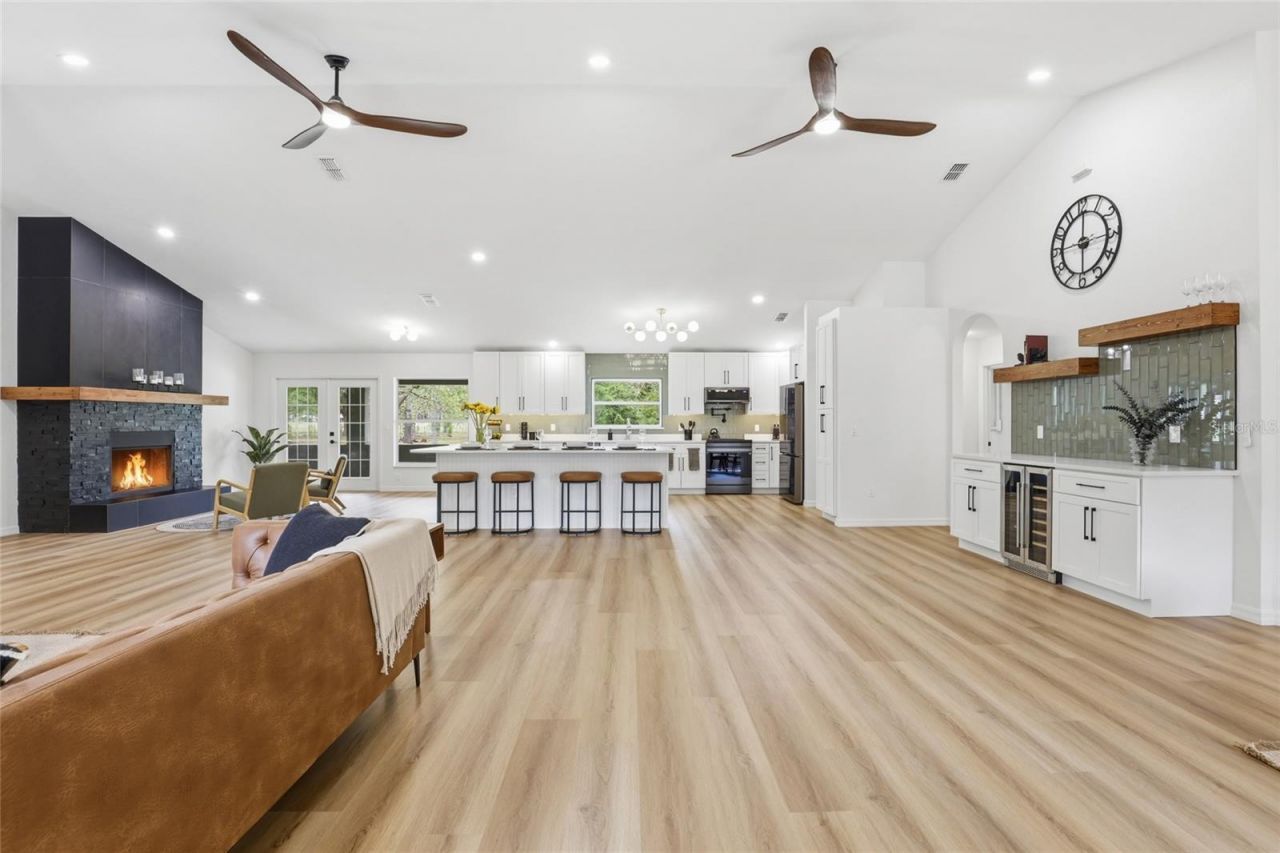 The amazing 4 bed 3 bath concrete block home features the perfect blend of elegance & quality in a peaceful surrounding. Before entering your eyes are drawn to the beautiful stained tongue & groove woodwork on the ceiling, which ties into the blend of modern & natural elements that is themed throughout the home. As you step through the inviting entrance you are met w/ soaring vaulted ceilings showcasing an impressive open entrainer's dream. The cozy & majestic fireplace w/ built-in shelving, the massive kitchen w/ island seating, the wine bar w/ floating shelves, dining area & living room are all in one grand space. There's room for everyone to be nearby, while having their own separate space in a large gathering. The primary bedroom has ample space for seating, an office or workout area, w/ his & her closets leading the way to the spa-like wet room, w/ soaker tub, dual floating vanity, lighted mirror & 3 shower heads in the walk-in shower. The large laundry room is lined with solid-wood cabinets, quartz counters & an elegant backsplash, and connects to the outdoors and adjacent full 3rd bathroom. A bonus utility room is large enough to serve as a workout or office area, and connects to the large separate 4th bedroom w/ space for a kitchenette & future in-law suite. The home has been professionally designed w/ a new kitchen, roof, all bathrooms, flooring, fixtures, paint, water heater & a newer HVAC so all that's left to do is move-in. Outdoors you'll find a gated entrance & fully usable serene 5 acres, cross-fenced w/ options and space for an ADU, pole barn & detached garage. The back porch has a nice mix of covered seating and outdoor patio for grilling and looks out over a pasture enhanced by a variety of mature palms and cedars providing islands of shade in this truly idyllic setting. Located just minutes from Jonesville Park, I-75, Santa Fe College & Legacy Multipurpose Center, come see all this amazing property has to offer today!