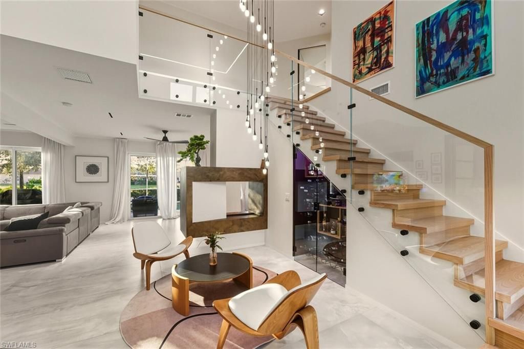This exceptional luxury modern residence has been completely renovated with a strong focus on architectural detail, premium materials, and refined craftsmanship throughout. The home welcomes you with an impressive 9-foot-tall custom aluminum entrance door, framed by side glass panels and a transom window above, creating an immediate sense of openness and elegance. The door is finished with a stainless-steel central handle, combining modern aesthetics with durability. Upon entry, the staircase has been fully redesigned and strategically relocated to the right side of the foyer. Crafted with solid wood steps, glass railings, and a wood handrail, the staircase is enhanced by integrated LED lighting. Beneath the stairs, a custom-built wine display has been seamlessly incorporated, adding both functionality and a sophisticated design feature. Adjacent to the staircase, a double-sided fireplace serves as a striking architectural focal point, providing warmth and visual continuity between living spaces. To the left of the entrance, a private office has been created, enclosed by a large modern door that allows natural light while maintaining privacy. Throughout the residence, all interior doors are flush-to-wall with concealed frames, delivering a clean, minimalist aesthetic with no visible trim. Recessed baseboards on the first floor and upper-level hallway further enhance the seamless, high-end architectural finish. Every element of this home reflects thoughtful design and luxury modern living, making it a truly distinctive property defined by elegance, precision, and contemporary style.