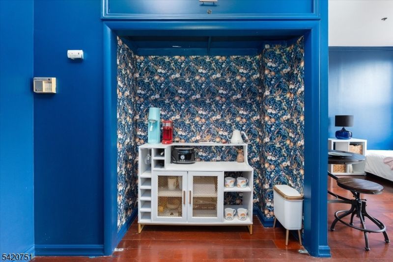 Here's your opportunity to own a magical and bespoke studio at The Mill - one of only three units with a 500sq ft patio! The outdoor space is complemented by a beautiful studio, painted in the very au courant color-drenched shade of "Symphony Blue", seamlessly bringing the outdoors in. This studio has central heat and air, its own washer/dryer, along with a separate kitchen with dishwasher and plenty of cabinet space that allows you a beautiful view of the patio. Exposed brick bridges the living and sleeping areas, along with possibilities for both a WFH and dining space. There's plenty of storage, too - the high ceilings allow for three tall storage closets and a clothing closet. This pet-friendly unit comes with one assigned parking space and an easy commute - it's one block to a NYC-bound train, and 5 minutes to a Park and Ride. Take advantage of all that The Mill has to offer, gym, pool, tennis/pickleball court, and much more!