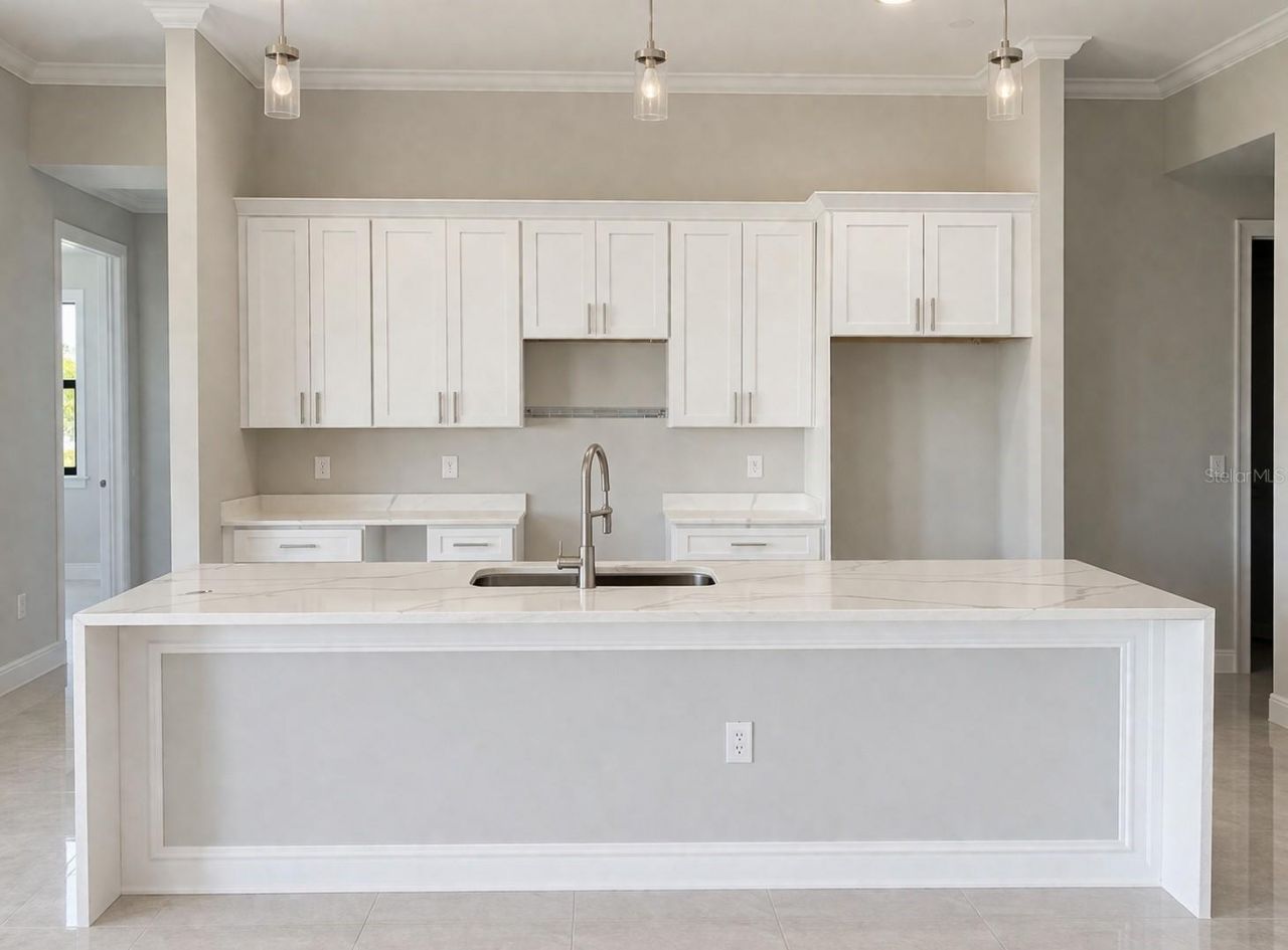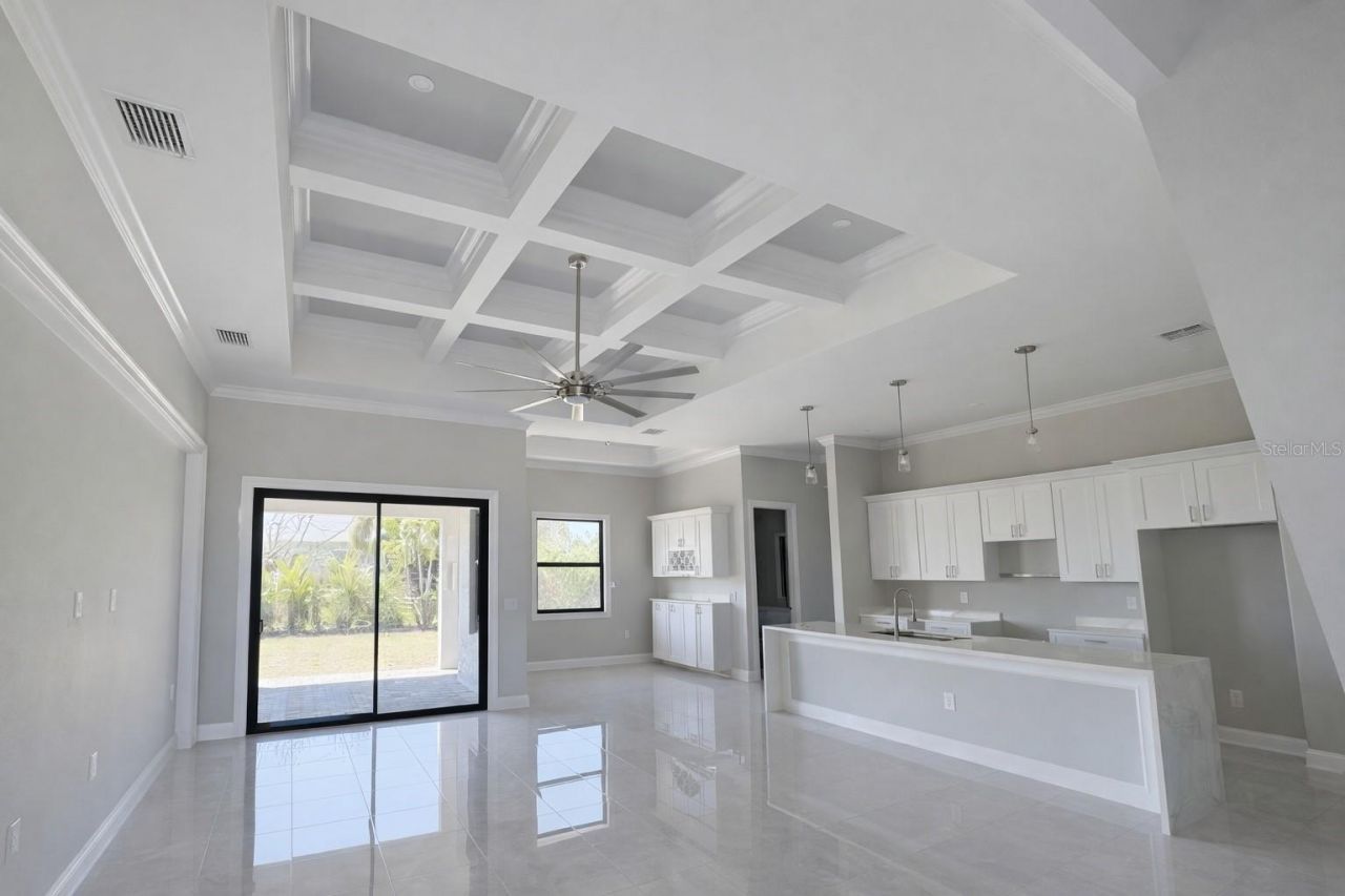 Stunning 2023-built 3-bedroom, 2-bath home with upgraded finishes throughout. 1,931 sqft of living space featuring coffered ceilings in the great room, quartz countertops with calacatta veining and waterfall island edge, white shaker cabinetry, and crown molding. Walk-in master shower with pebble stone floor, dual shower heads, and mosaic tile niche. Tile flooring throughout. Dedicated laundry room with quartz-top vanity and sink. Covered lanai with paver flooring, ceiling fan, and built-in outdoor kitchen with granite counter, grill, and sink. Paver driveway, dark designer garage door, and epoxy-coated garage floor. 2-car attached garage. Property is vacant and available for immediate showing.