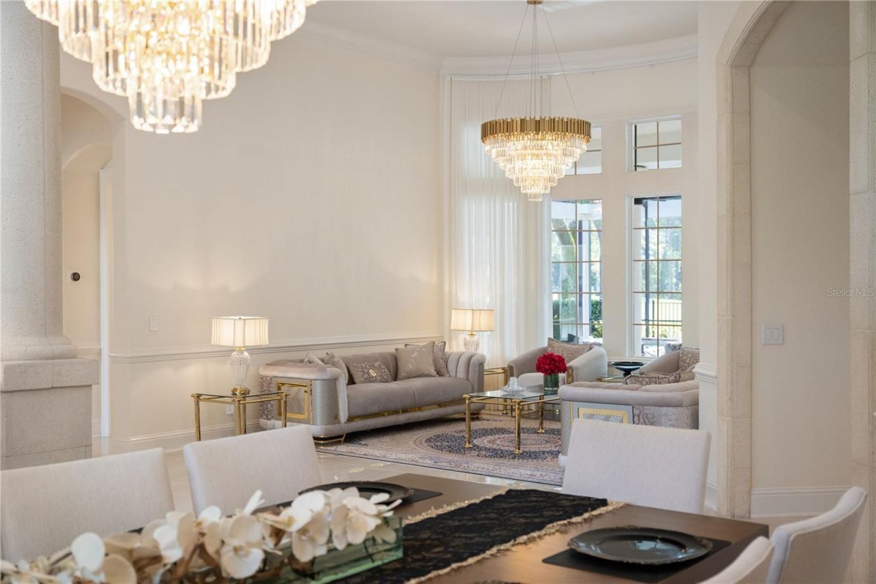 Sophisticated Elegance best describes this stunning remodeled 5 Bedroom/5FULL Bath/2 Half bath Golf Course Estate Home in Keene's Pointe. Upon entering this residence built by master custom builder J. Richard Watson, you will discover the seamless beauty of the 48 x 24 tiles that grace the entire main floor and set the tone for this gorgeous interior space filled with abundant natural light. Your eyes are drawn to the impressive living and dining rooms that meld together in this open concept while already eyeing the dramatic Family Room view through a graceful arched cast stone passage into the 'heart of the home. The remodeled kitchen and family room display an elevated level of design rarely seen today, equipped with new cabinetry and accent lighting accentuating the Cambrian custom countertops and back splash areas and new appliances by Wolf, Sub-Zero and Cove. The adjacent Family Room has a clever hospitality bar hidden behind tall double doors so discreet and refined that you are delightfully surprised when you open them to see the mirrored walls and lighted cabinets storing sparkling glasses and a wine refrigerator! Attractive fireplace framed out in a custom Cambria surround is flanked by matching accent walls to feature your most cherished collectibles. From the foyer to the kitchen, you note several coordinated glass and gold chandeliers that highlight the ivory walls, fresh interior paint and new can lighting and ceiling fans throughout. You will also find a large study, the primary retreat and a guest-ensuite bedroom on the main floor. Just off the kitchen, a lovely staircase beckons you up to a mid-level reimagined home theatre with the latest in sight, sound and special effects. New plush red leather recliners are enhanced with vibrations that mimic the main event on the screen to make you feel like you are in it - not just watching! Other rewards include the private half bath, beverage bar, professional popcorn machine and extra seating to enjoy the ambiance without leaving the room! Continuing up the staircase you will discover the second floor featuring 3 bedrooms, 2 Full Baths: (1 ensuite and 2 bedrooms sharing an oversized bathroom with dual vanities, and soaring ceiling with skylight!) Both the enormous bonus room and the ensuite bedroom open to a screened balcony overlooking the pool, golf course and the nature preserve in the distance. Second floor is all engineered hardwood throughout and all bathrooms are renovated. The spacious outdoor screened living area is impressive as well, with a large pool with pebble tec finish tucked within so easy to maintain its pristine sparkle keeping nearby oak tree leaves out of bounds! Enjoy the built-in fire pit and conversation area, along with a separate wet bar under the covered lanai. There is an additional summer kitchen featuring a natural gas grill and built in 'Green Egg allowing you to manage most any cookout gathering! Finally, light up any event you host any day of the year with the custom Massey Outdoor Landscape Lighting color carousel that allows you to choose your color for any seasonal holiday simply by pressing your app! So, sit back and enjoy the view of the wide eighth fairway of the renown Jack Nicklaus Signature Golf Course in Keene's Pointe. Come live the lifestyle for which Keene's Pointe is famous and add just an extra splash of refined elegance to the mix!