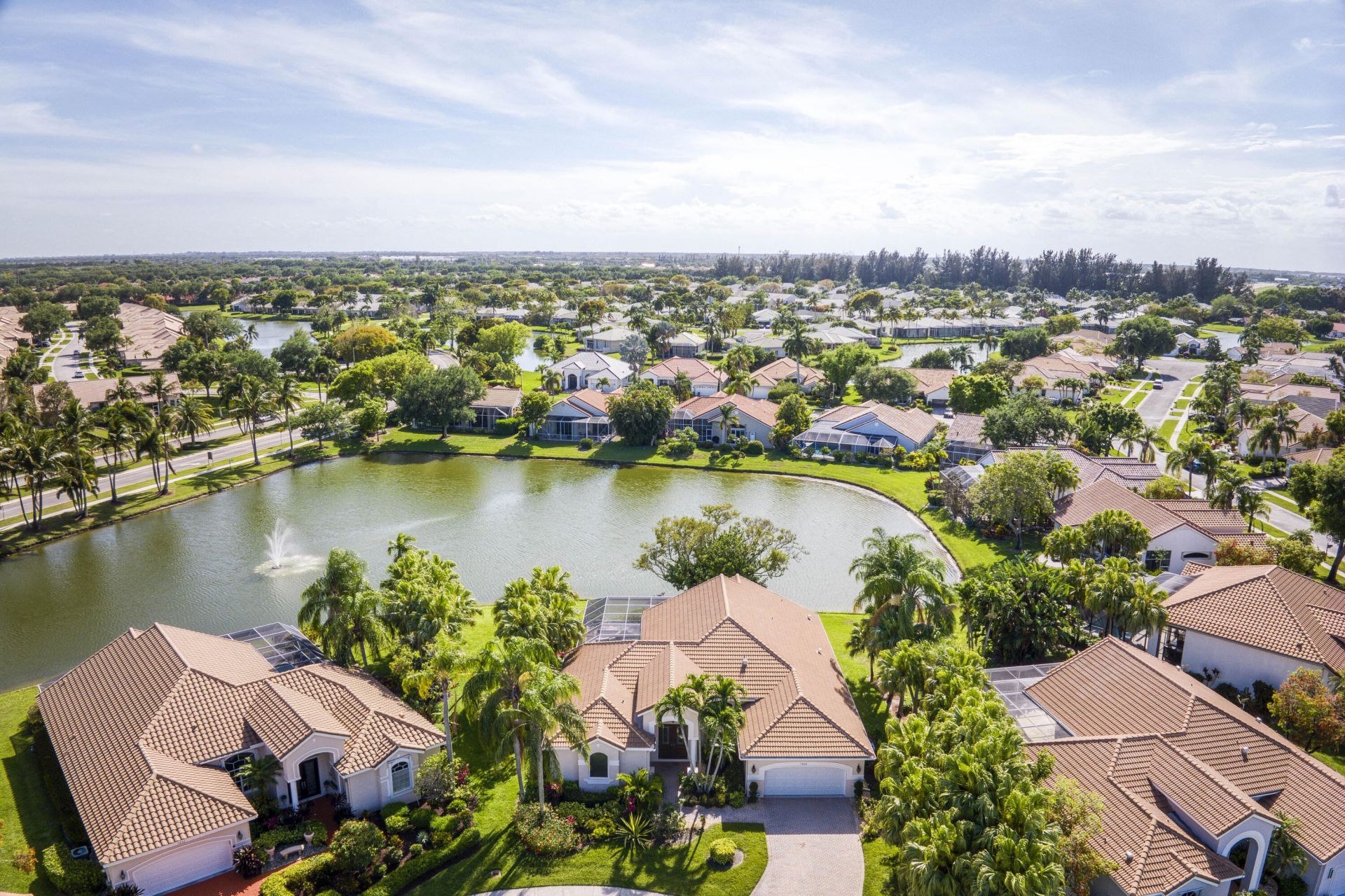 Serene lakefront living with a heated pool, spa, and tranquil fountain views from nearly every main living area define this beautifully updated home in gated Aberdeen Country Club. With the big-ticket items already completed-new impact windows and doors (2025), new roof (2021), and dual A/C systems (2022)-enjoy peace of mind and effortless living. The open floor plan is filled with natural light, featuring polished tile flooring, vaulted ceilings, and walls of impact glass that showcase the stunning water views. The spacious primary suite offers two custom walk-in closets and direct access to the pool & patio. The private backyard oasis features a heated pool and spa with paver deck overlook the peaceful lake and fountain. Plus a full laundry room, 2-car garage, and zoning for three A-rated schools. Located in Aberdeen Country Club, residents enjoy access to golf, tennis, fitness, and resort-style amenities, with HOA covering cable, lawn care, and security.
