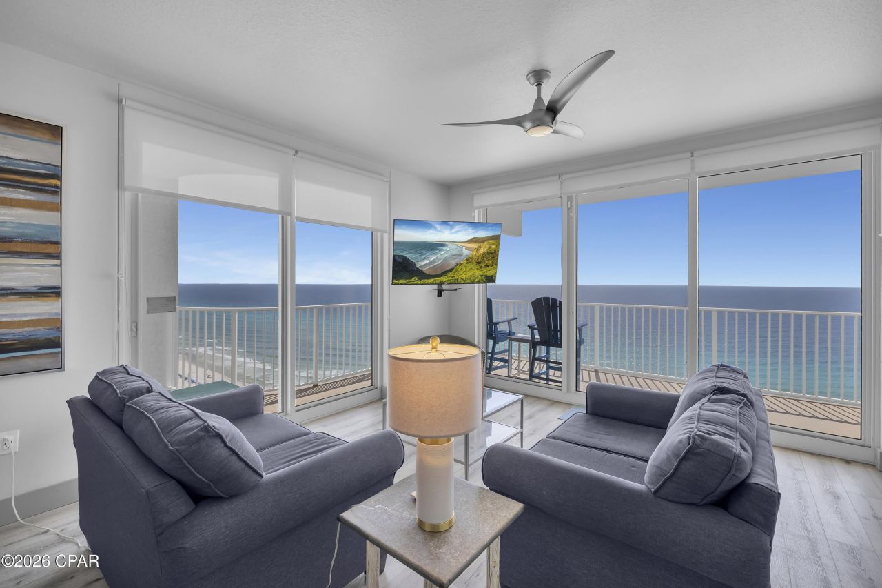 WRAPAROUND CORNER BALCONY | HIGH-FLOOR GULF, POOL, AND COASTLINE VIEWS | DEEDED PARKING ON THE 8TH FLOOR ATTACHED GARAGE | Shores of Panama Unit 2003 is a 20th-floor corner residence featuring the desirable Type E floor plan with two bedrooms, two full bathrooms, and a bunk room with an additional half bath. Positioned on the west-side corner of the building, the wraparound balcony captures expansive views of the resort lagoon pool, the Gulf, and the Panama City Beach coastline in both directions. The elevation and corner position also create exceptional sunset views. The primary bedroom is located on the Gulf side with direct balcony access, allowing water views from both the bedroom and the main living area. The kitchen has been fully remodeled with new cabinetry, quartz countertops, stainless steel appliances, and a distinctive blue mermaid tile backsplash. The interior presents a clean, modern look with consistent flooring throughout the unit, updated light fixtures, ceiling fans, and rolling shades installed on all windows and glass doors. Both bathrooms have been updated with walk-in tile showers and glass enclosures. The unit also includes a front-load washer and dryer. A deeded parking space on the 8th floor of the attached parking garage adds convenience and allows direct building access without crossing the street to a separate parking structure. Shores of Panama Resort features the largest Gulf-front lagoon pool in Panama City Beach. The zero-entry tropical pool includes palm-lined islands, fountains, and a spacious hot tub set along the resort's private beachfront access. Additional amenities include an indoor heated pool and hot tub, a 24-hour fitness center, and a seasonal poolside Tiki bar. The resort's central Panama City Beach location places dining, shopping, and entertainment nearby. Pineapple Willy's is adjacent to the property for beachfront dining. Laketown Wharf, directly across the street, offers Juan Taco, Wharf Seafood Buffet, The Candymaker Ice Cream Shop, PCB Pizza, In Cahoots for breakfast and brunch, The Press coffee shop, The Bun Lab, 810 Billiards & Bowling, a salon and nail bar, and additional retail options. Nearby attractions include Dolly Parton's Pirates Voyage Dinner & Show, Topgolf, and McGuire's Irish Pub, with Tootsie's Orchid Lounge scheduled to open in 2026 as the area continues to see new entertainment and dining investment. HOA dues are $4,354. 06 per quarter. All information is believed to be accurate but should be verified by buyers if important.